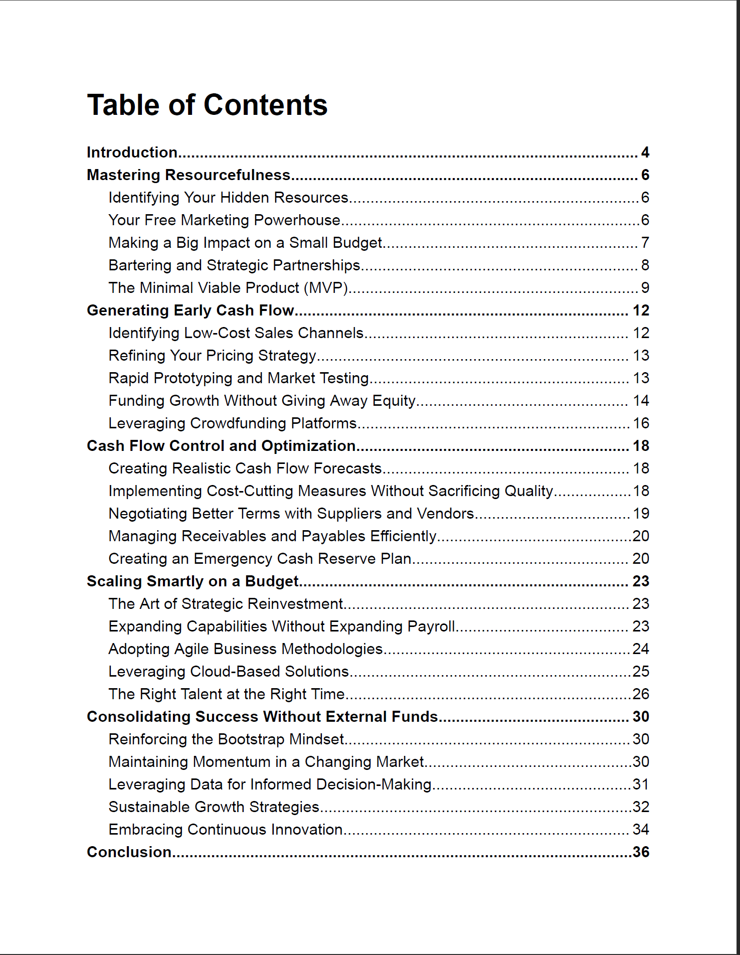 The ebook teaches you how to build a successful business without relying on external funding, focusing on using creativity and resourcefulness to grow. It offers easy-to-follow strategies for generating early cash flow, leveraging skills and networks, and managing resources effectively, empowering businesses to scale while maintaining financial independence.